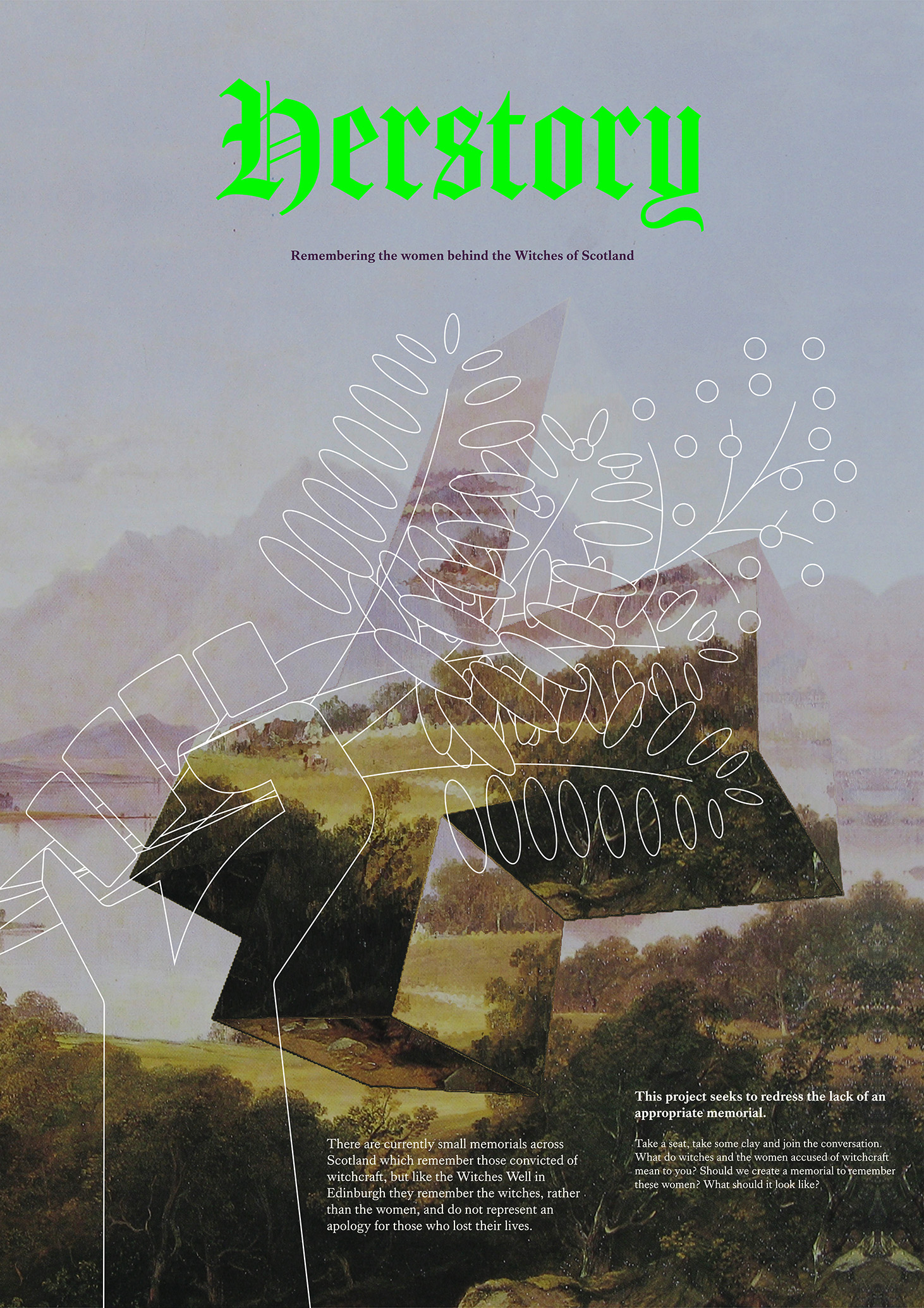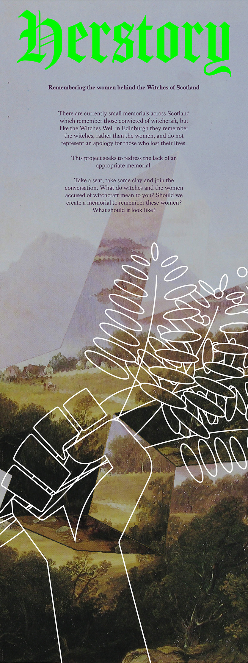 Herstory is a project aimed at commemorating the women who were subjected to the scottish witch trials. The project consists of the promotional material for a workshop that would involve members of the public ideating their ideas of a memorial to these women through the use of modelling clay.